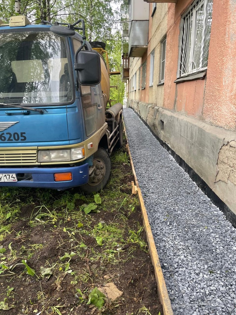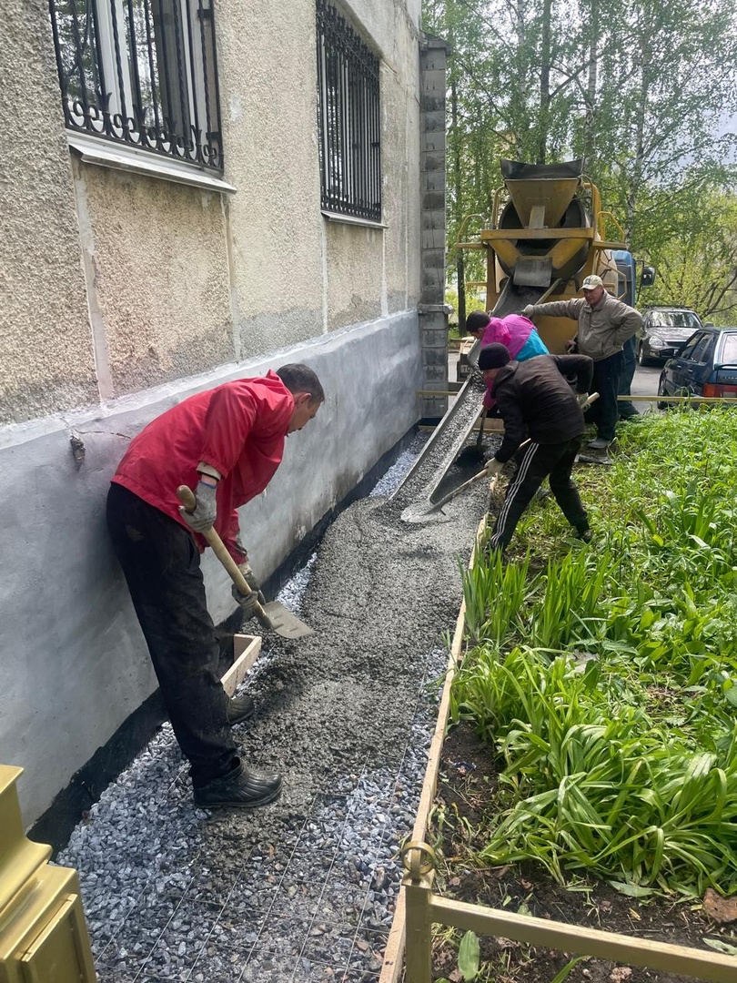 ? Забетонирована очередная отмостка – вокруг дома №15 по ул. Шишкина. Это важная часть дома – «охраняет» стены, цоколь и подвал от влаги, осадков, отводит талую и дождевую воду от здания. ?