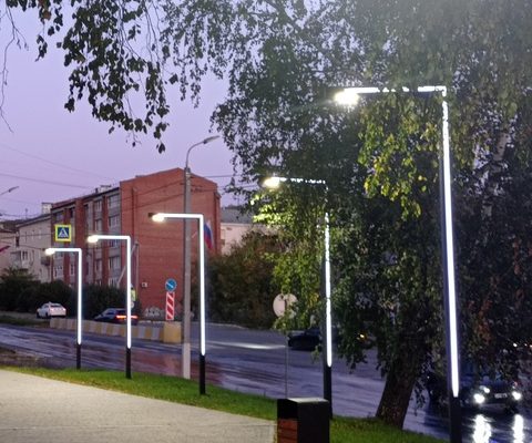 В сквере около дома Грибоедова, 3а, около библиотеки «Окна» зажглись фонари. Г-образные уже работают в полную мощь. Волшебные синие шары пока полностью