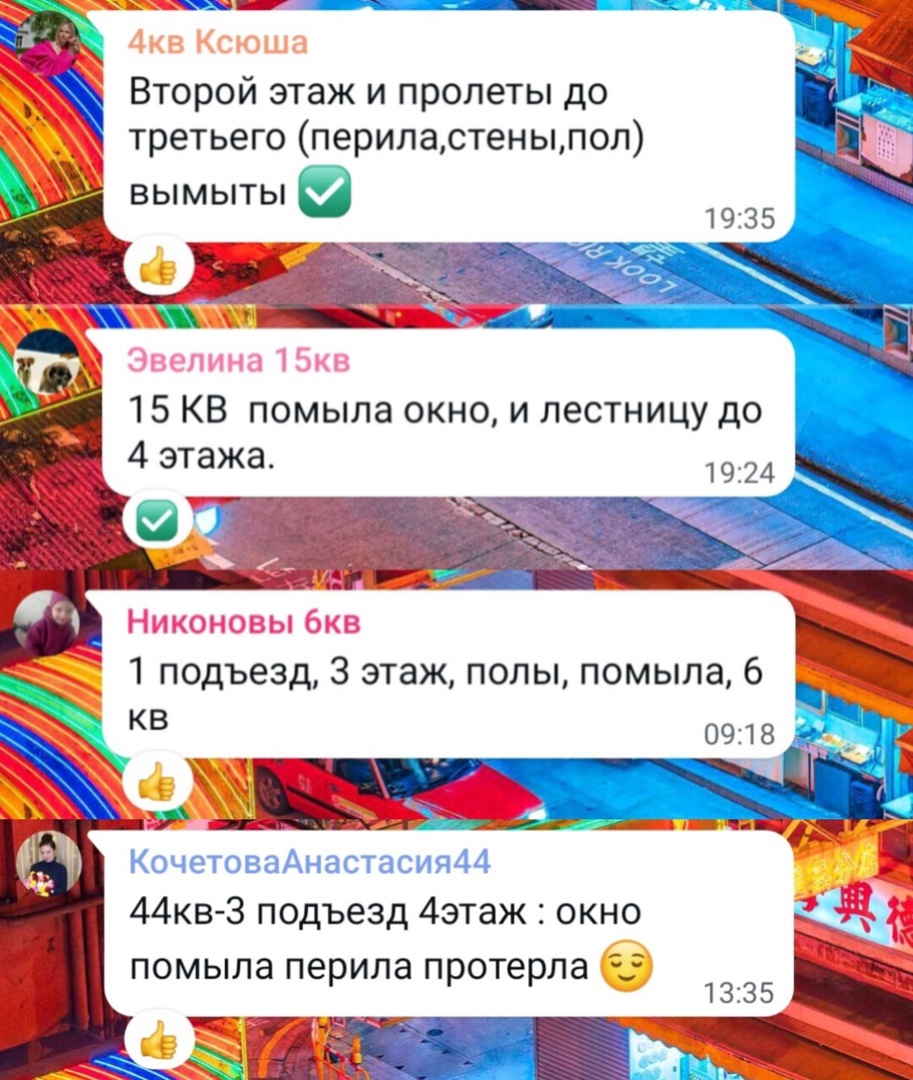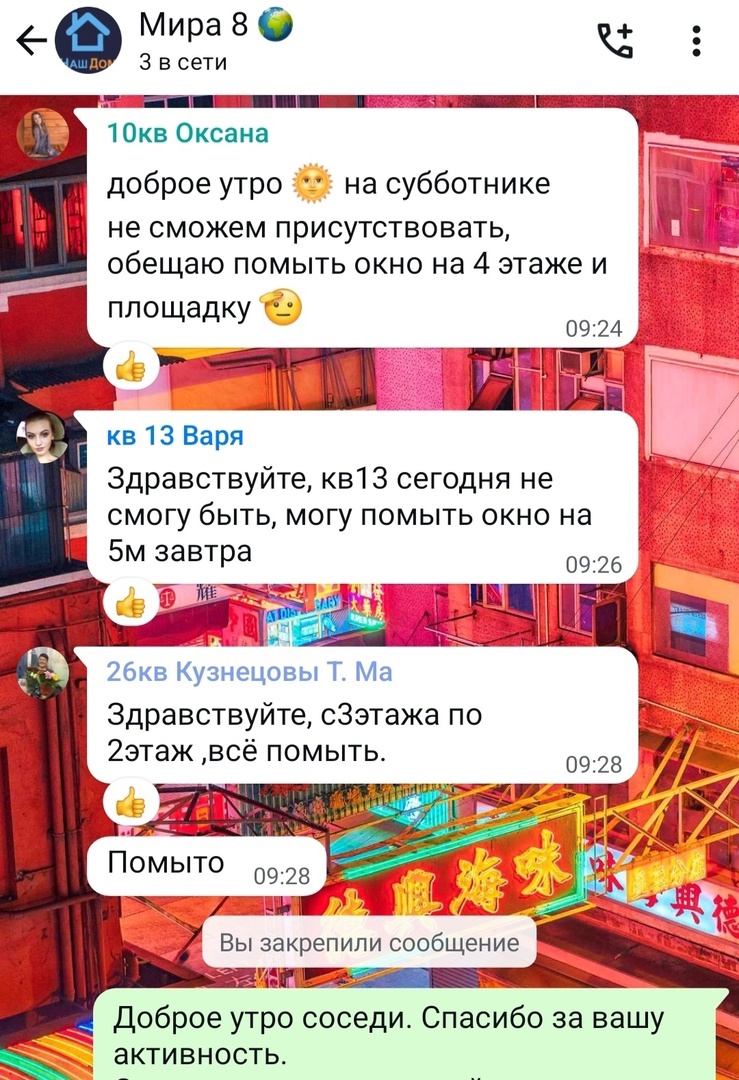 «Наш первый рывок в мир порядка и чистоты состоялся 19-го апреля! – рассказывает Наталья Андреевна Михайлова, старшая дома №8 по проспекту Мира: Первые на очереди, по традиции, подъезды. Сегодня предлагаем наш пост в необычном формате — дадим немного «подглядеть» за нашим активным и неравнодушным чатом Мира 8.
