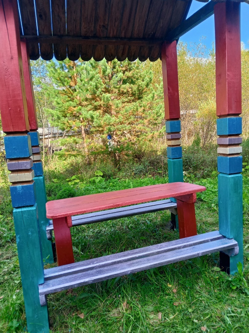Нарядная беседка, яркие скамейки, цветная песочница – во дворе дома №40 по ул. Урицкого покрашены элементы детской площадки.