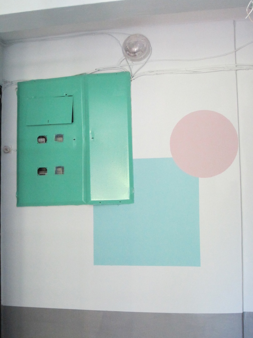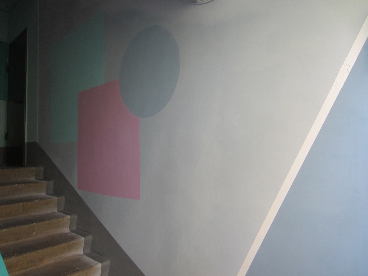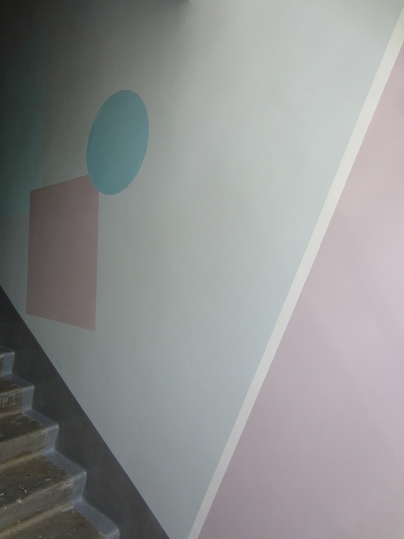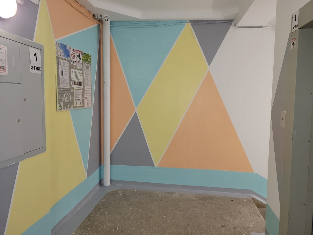 Разнообразные фигуры в пастельных, неярких, мягких тонах – подъезды дома №29 по ул. Зелёной.