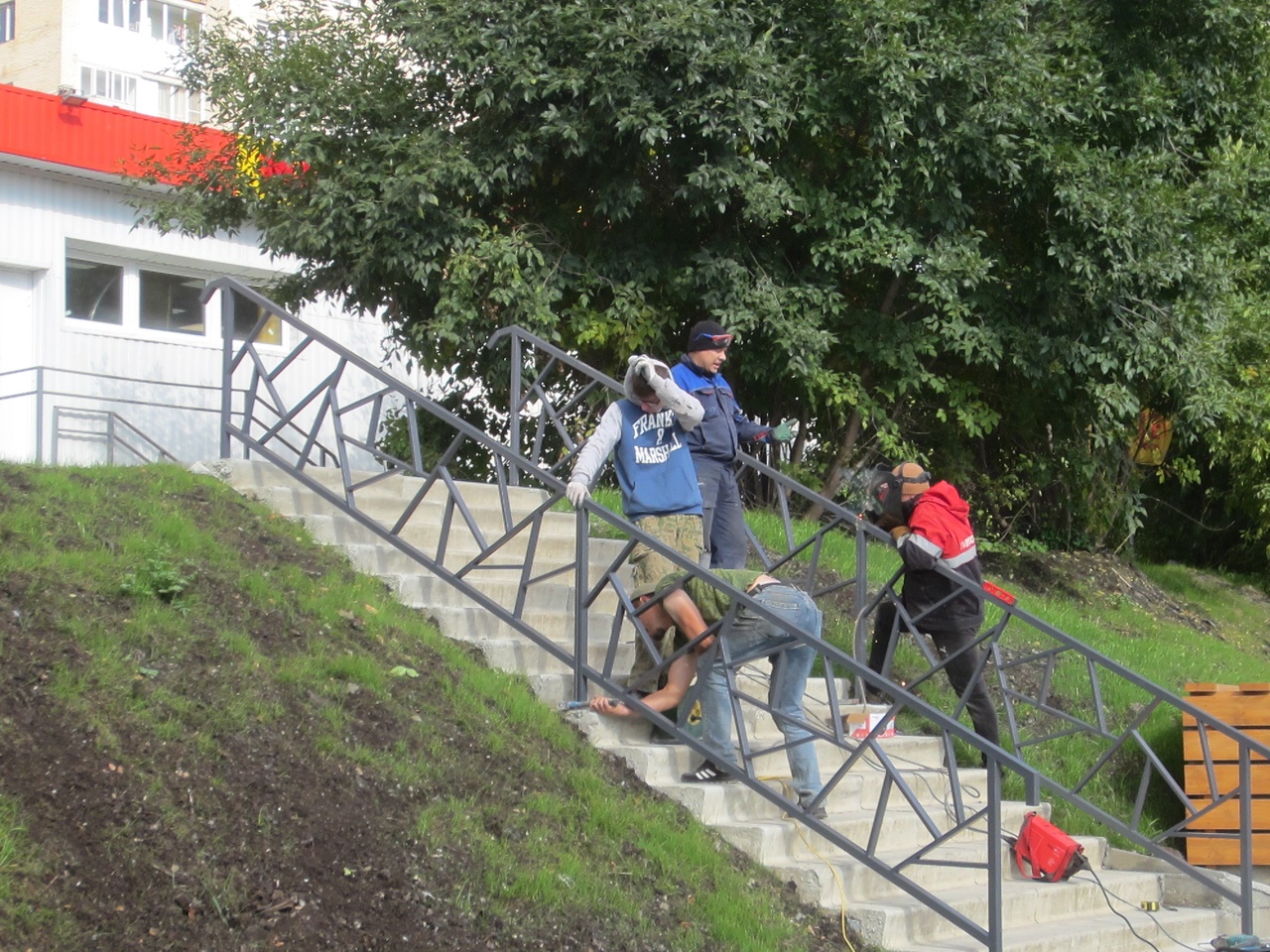 Заканчивается отделка лестниц. Нижняя ступенька к дому Грибоедова, 1а, облагорожена (жители беспокоились), во всю идёт монтаж перил. Они будут установлены на всех примыкающих лестницах.