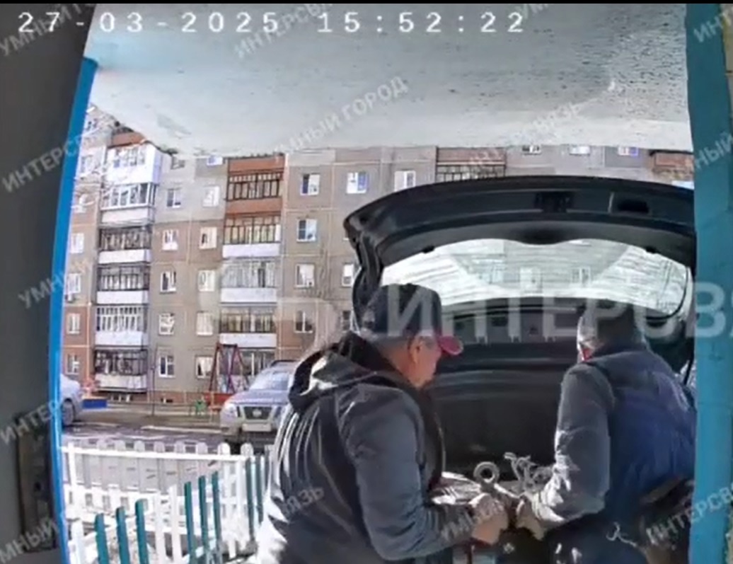 Система видеонаблюдения зафиксировала, что около 16 часов, 27.03.2025, два человека вывезли части двигателя лифта.