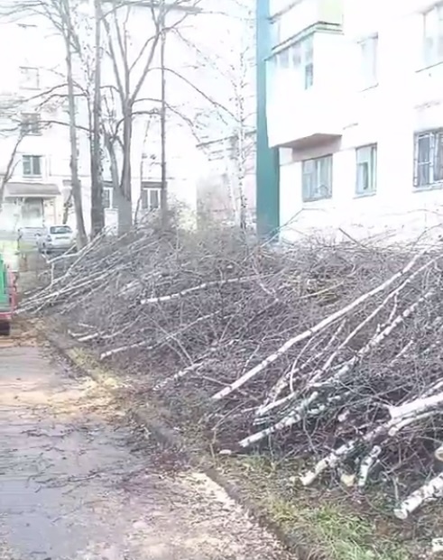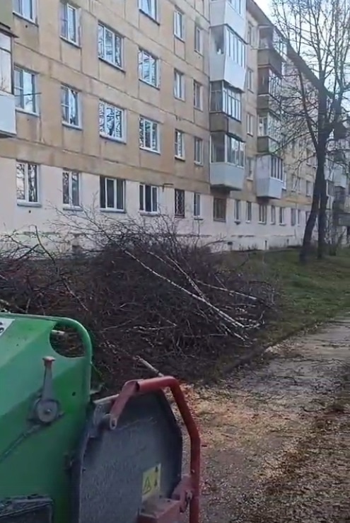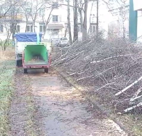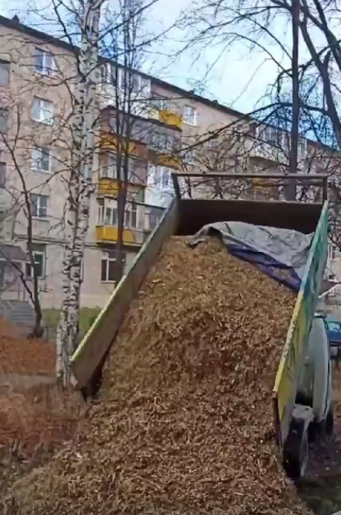Тонкие ветки также измельчены шредером, но вот опилки, по просьбе жителей, оставлены. Их можно использовать в палисадниках, как мульчу для цветов