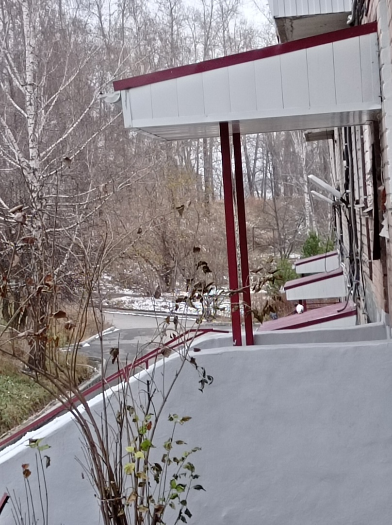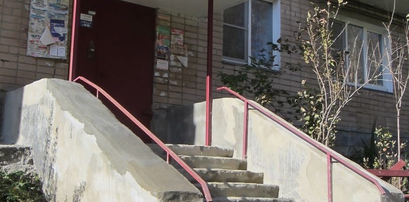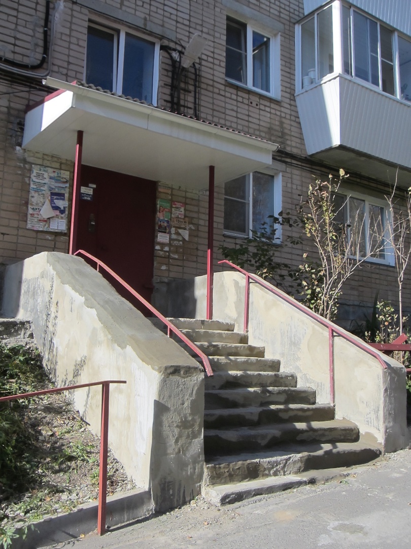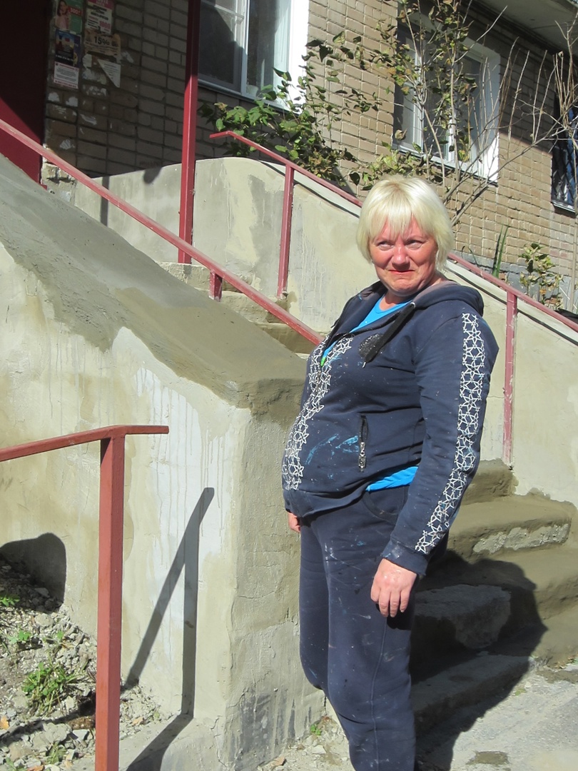 Штукатур-профи Наталья Татаренко спасала крыльцо 4-го подъезда дома №17 по ул. Шишкина. Атмосферные явления довели штукатурку боковин и ступени до ободранности и разрухи. Пришлось восстанавливать покрытие в тёплые осенние дни.