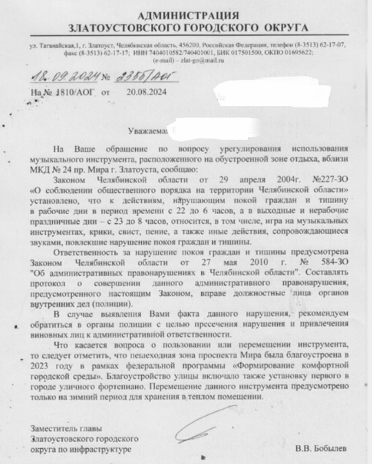 В этом случае можно порекомендовать жителям обратиться к чиновникам рангом выше. В Министерство культуры региона, например. Вице-губернаторы у нас ещё есть. Объяснить им, почему златоустовцы с проспекта Мира уже испытывают стойкое неприятие фортепианной музыки.