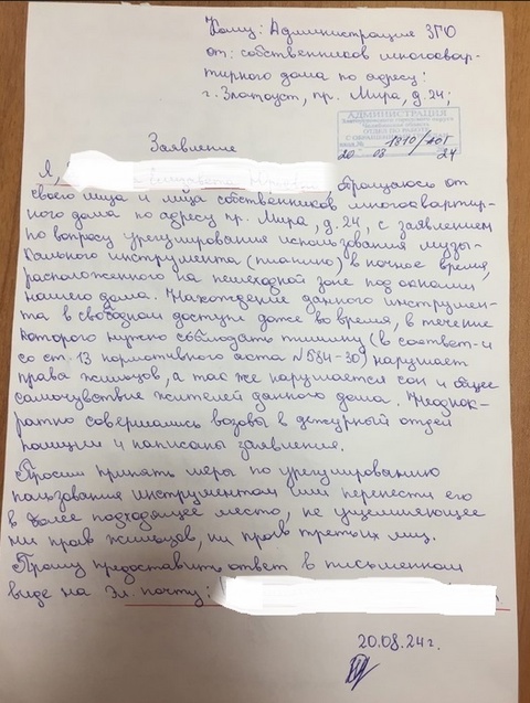 Поэтому горожане написали письмо на адрес администрации ЗГО с просьбой, установит пианино в другое место, где оно не будет мешать сну и отдыху людям.