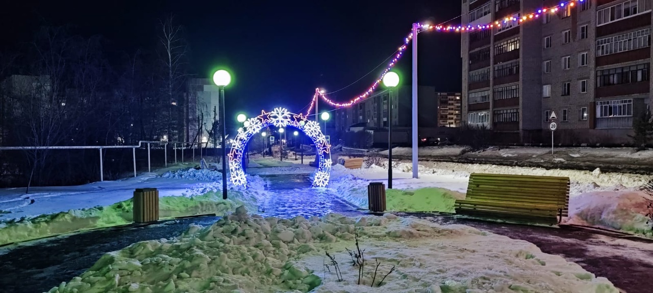 Зимой периметр украсился светодиодной подсветкой, а проход – светящейся аркой.