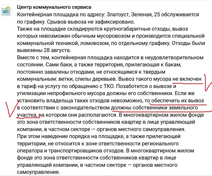 ЦКС написал: «Контейнерная площадка по адресу: Златоуст, Зеленая, 25 обслуживается по графику. Срывов вывоза не зафиксировано.