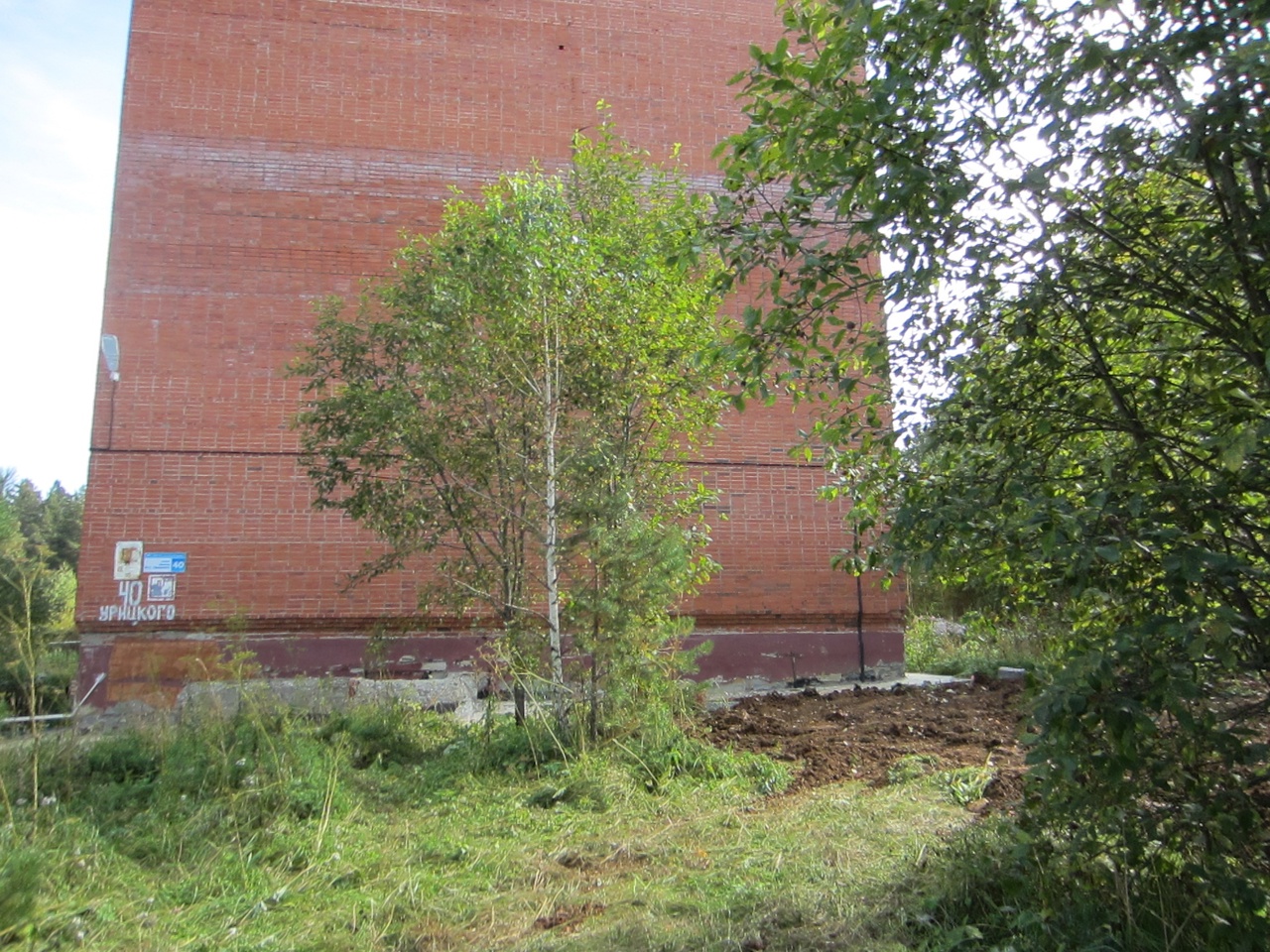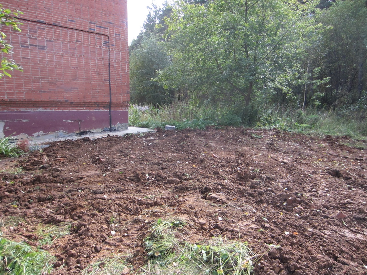 Тяжёлая техника истоптала ровную зелёную полянку на торце дома.