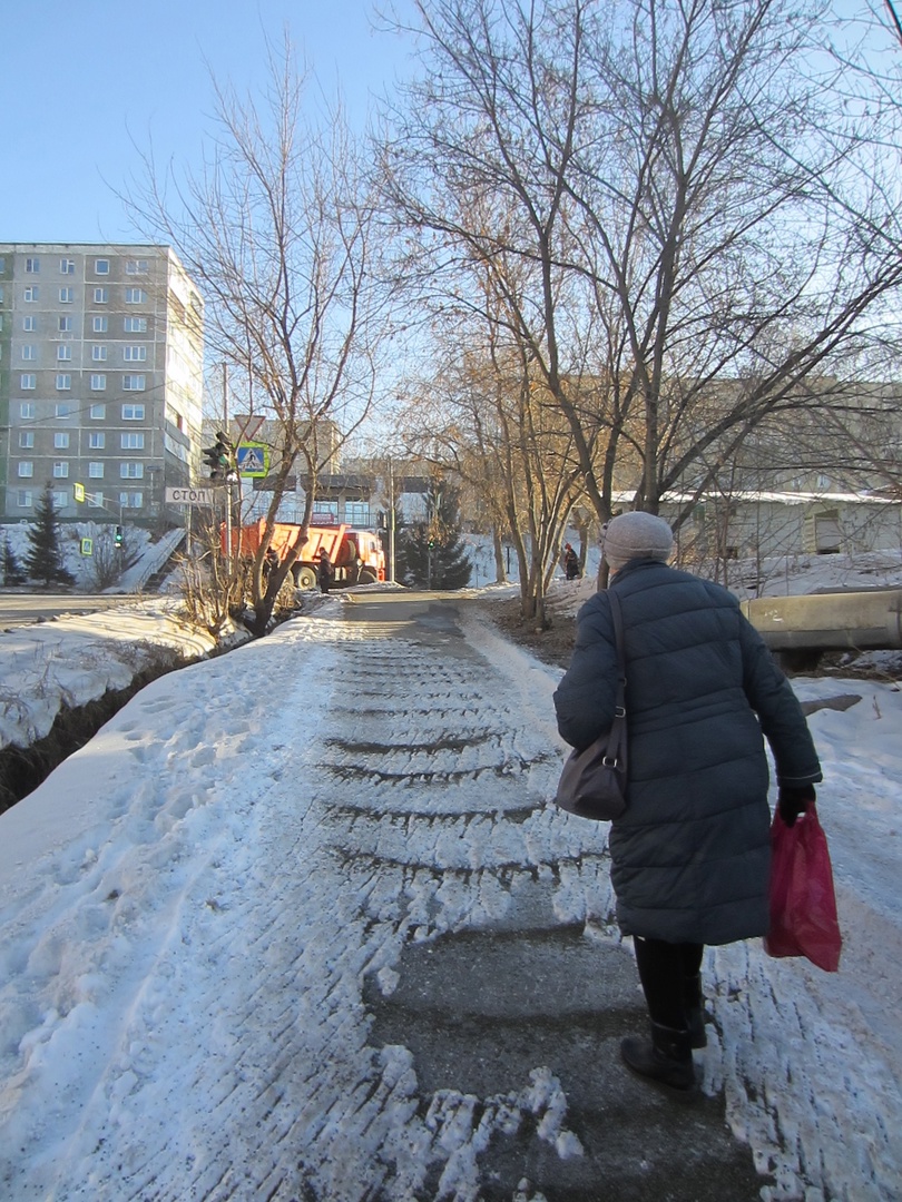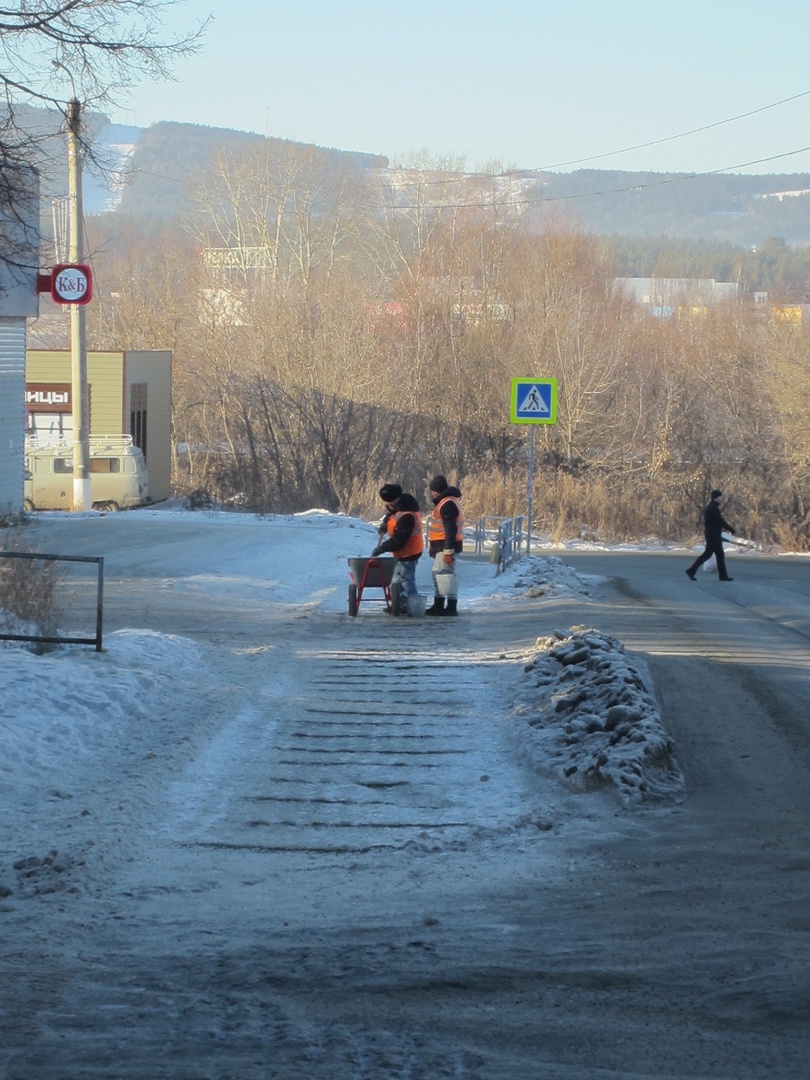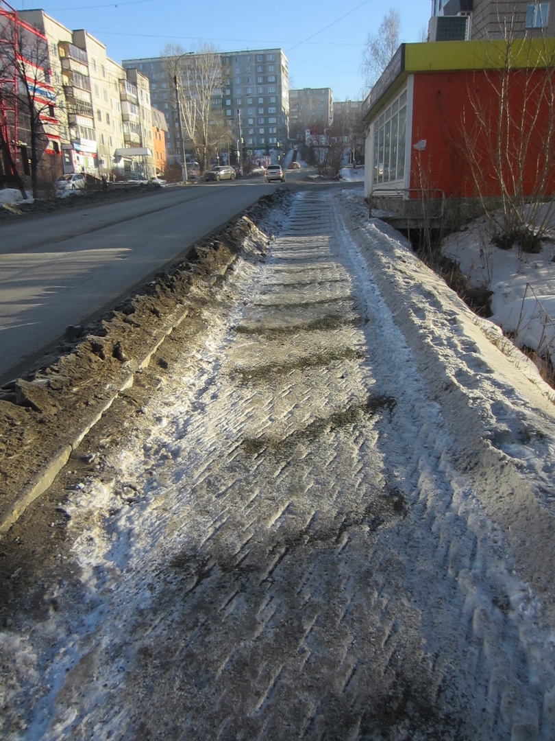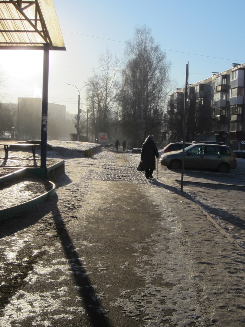 Он разбил лёд на мелкие части, выпуклые и скользкие. Прохожие крались по узкой тропки по краю тротуара, потому, что наступить на подобную «модернизацию» было просто нереально.