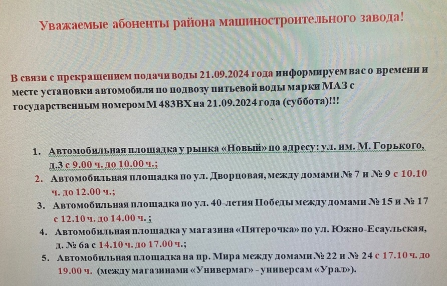 В связи с прекращением подачи воды в субботу 21-го сентября информируем вас о времени и месте установки автомобиля по подвозу питьевой воды марки МАЗ с государственным номером М483ВХ в этот день: