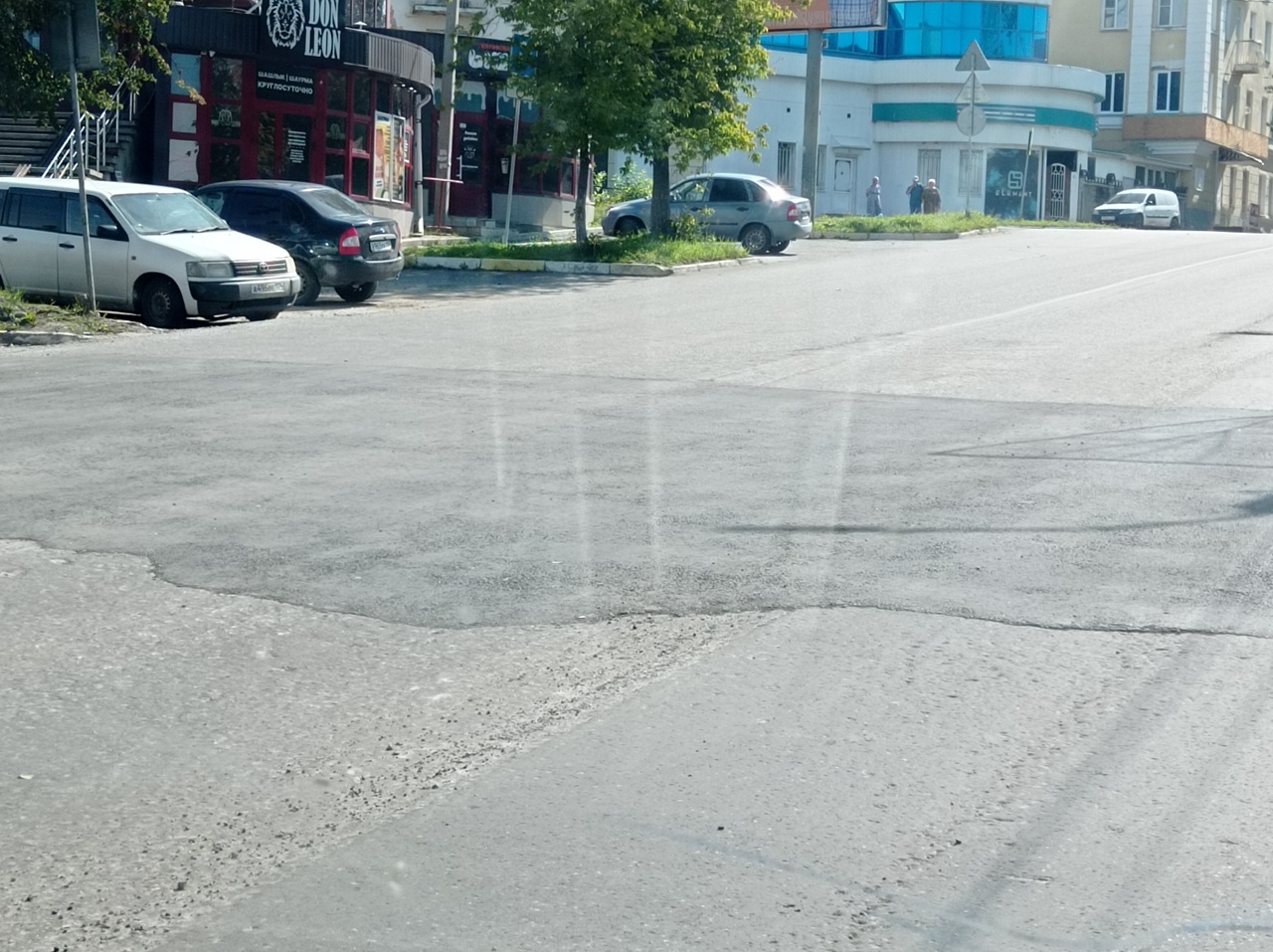 На фото – дорожное покрытие около Стадиона: сначала отсыпали щебнем, потом заасфальтировали. Около Универмага после окончания работ пока только отсыпка щебнем.